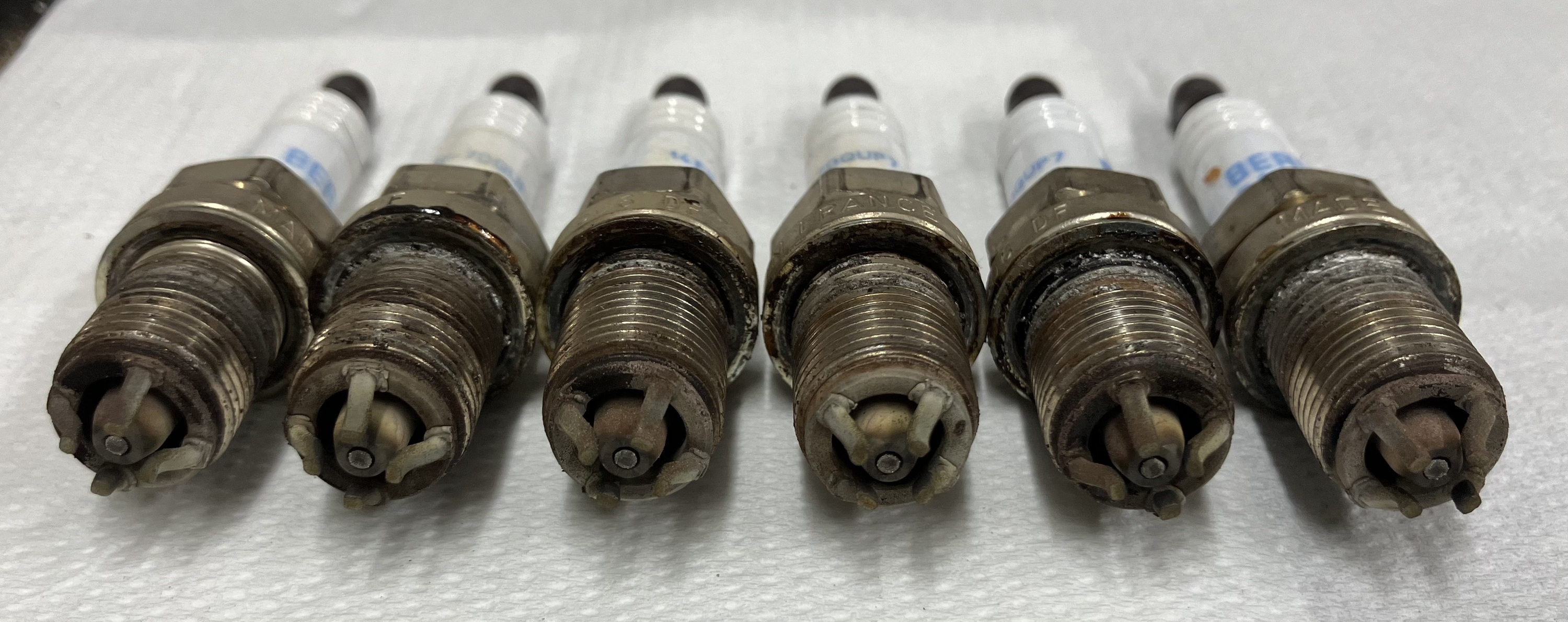 So sehen die Zündkerzen nach ca. 60.000 km aus. Die neuen wurden mit sabrease leicht eingepinselt und die Zündspulen mit nicht aushärtendem Silikon eingesetzt.